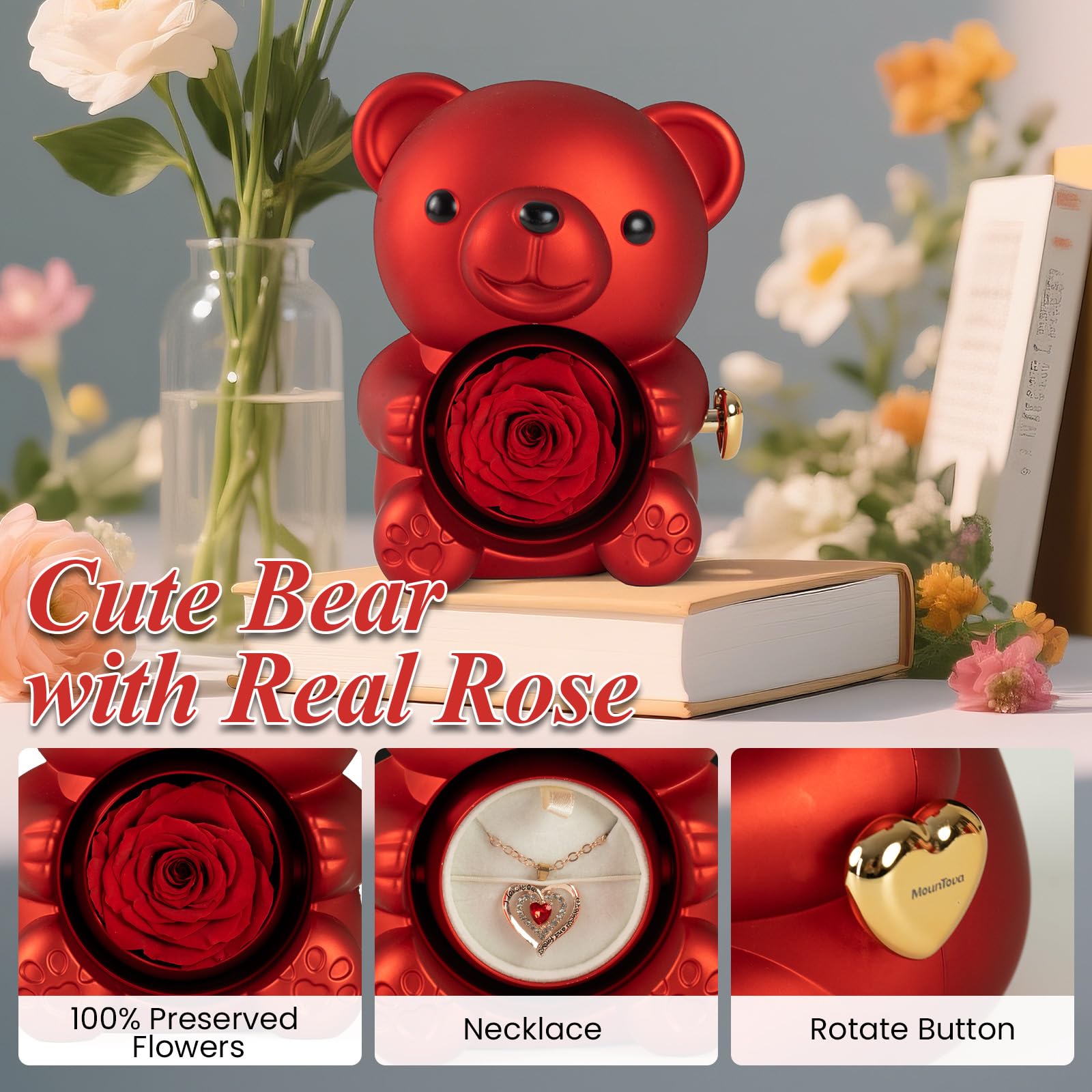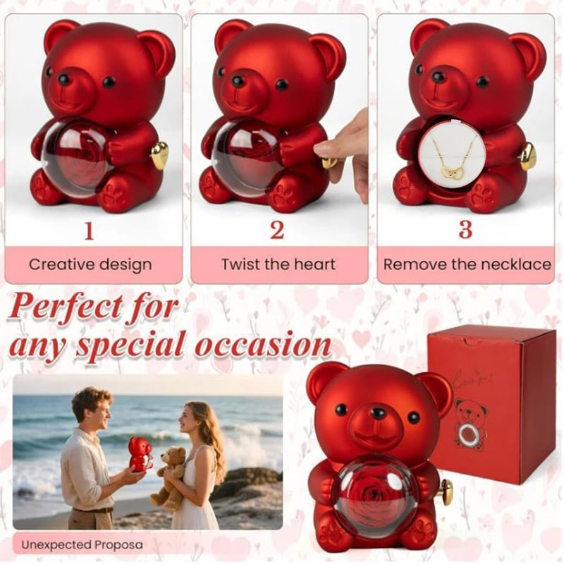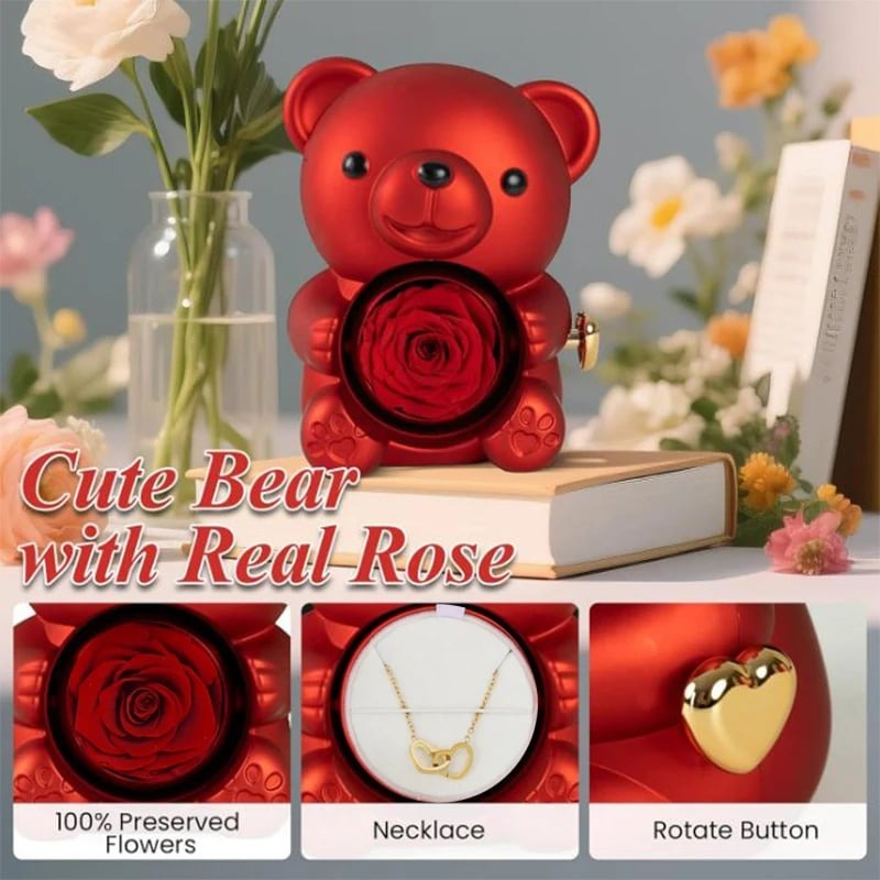 💖 Unique & Cute Bear Design: The adorable teddy bear holds a stunning preserved rose inside a transparent plastic cover. Rotate the golden heart-shaped knob to reveal a hidden neacklace jewelry behind the rose, adding an element of surprise for your beloved one!