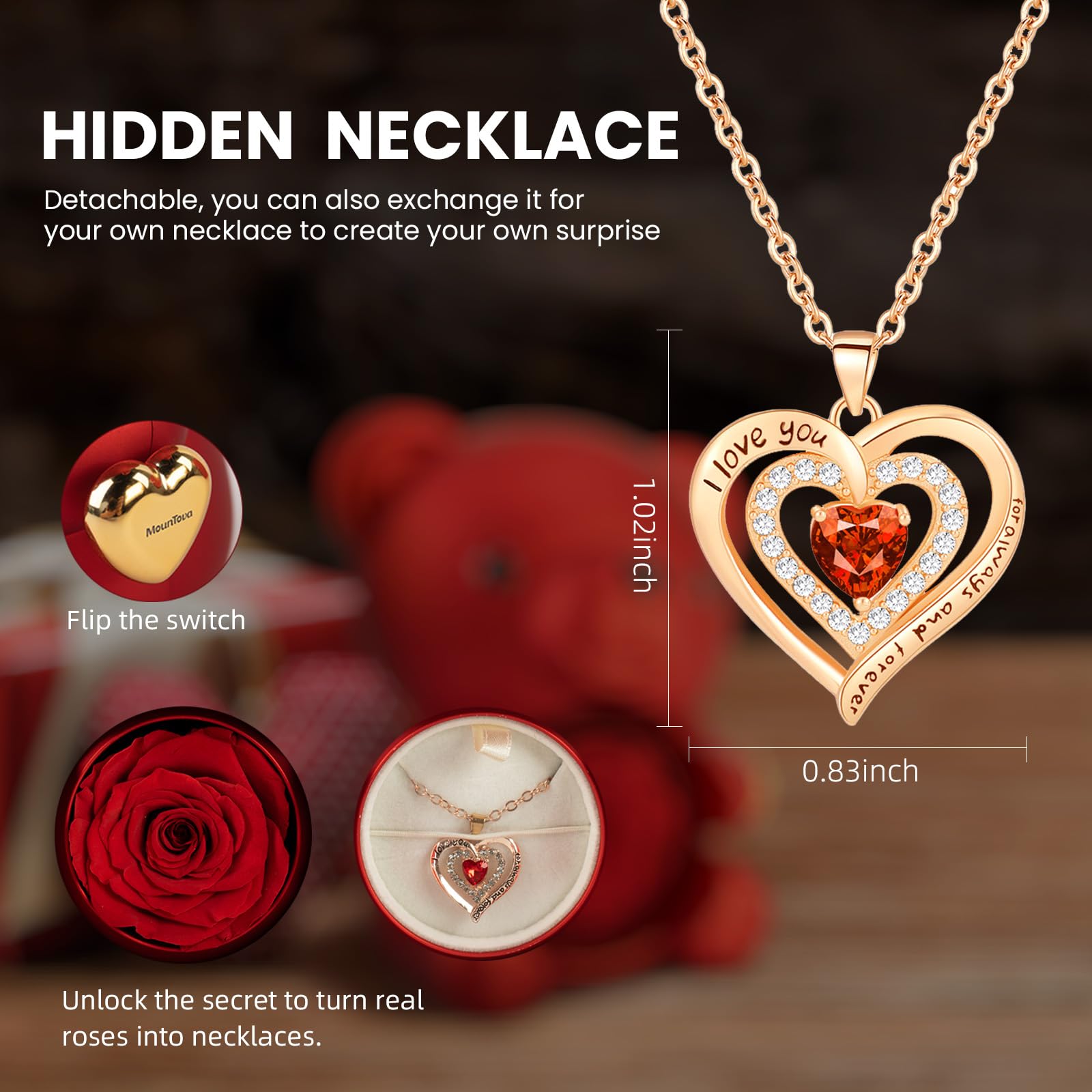 🌹Personalized Design--This Eternal Rose Teddy Bear Jewelry Box offers unique personalized touch ,We can provide engraved names on the heart necklace, which is an exclusive gift for you.