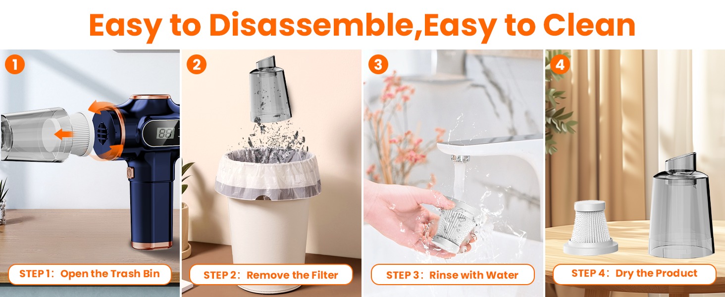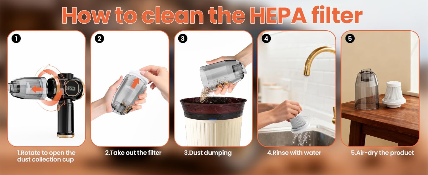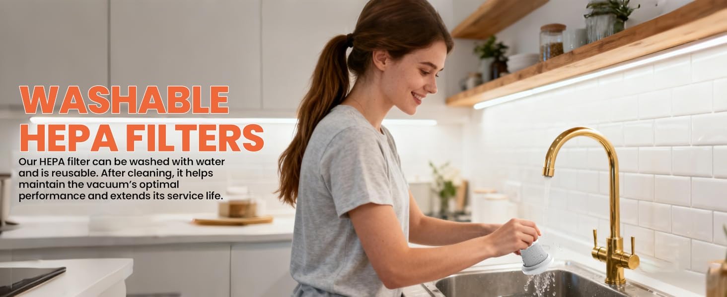 【Transparent Dirt Cup & Easy-to-Clean HEPA Filter】 The transparent dirt cup lets you easily see inside, so you always know when it needs emptying. Both the dirt cup and HEPA filter are washable — just rinse them with water. Once dried, the HEPA filter can be reused, extending the product’s service life.