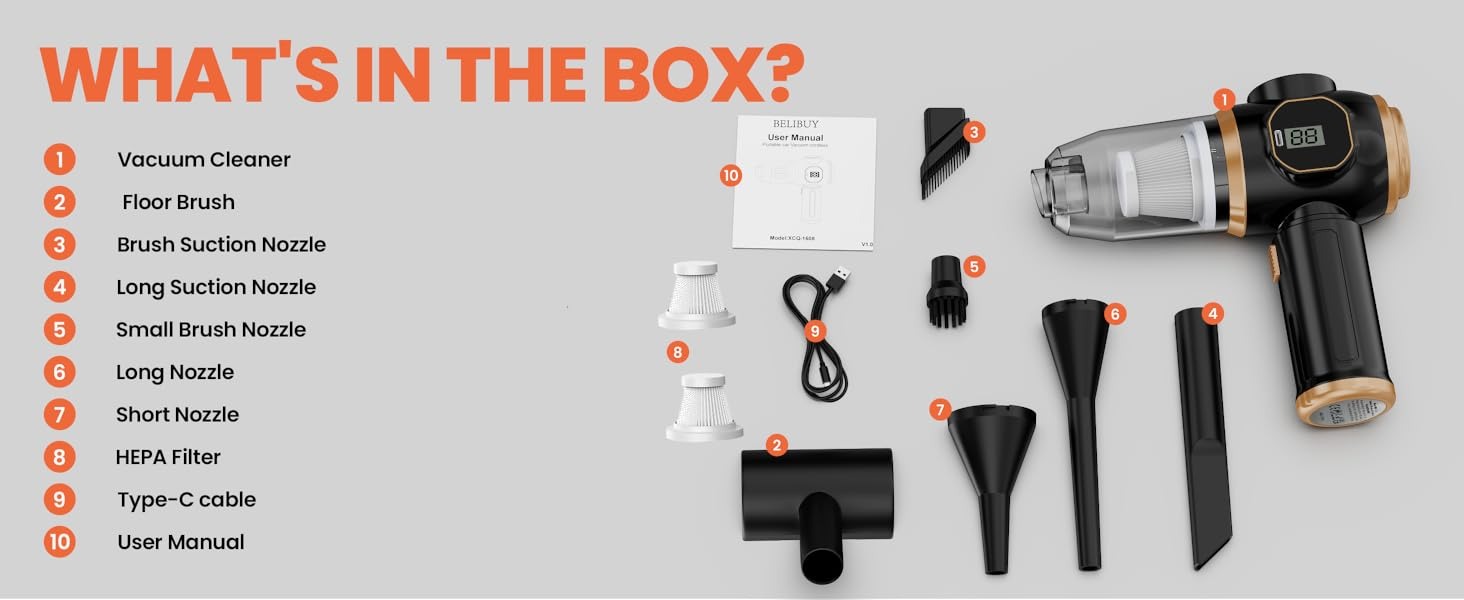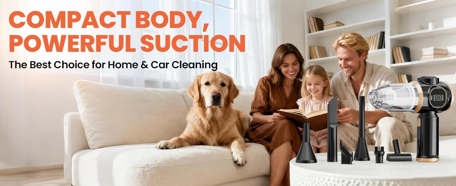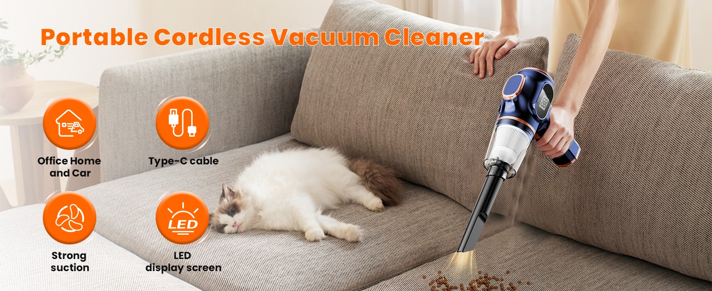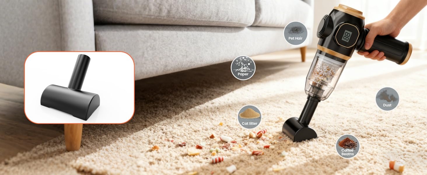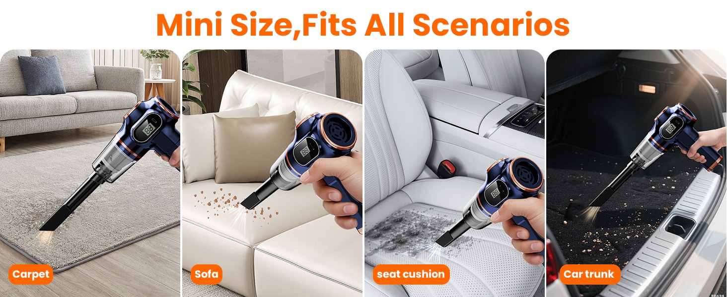 【Lightweight & Highly Portable】 This handheld car vacuum only weighs 0.8 lbs — its overall design is lightweight and compact, making it incredibly easy to carry and store. Unlike traditional vacuums, the wireless design eliminates cleaning hassles: no more struggling with bulky, heavy machines or tangled cords.