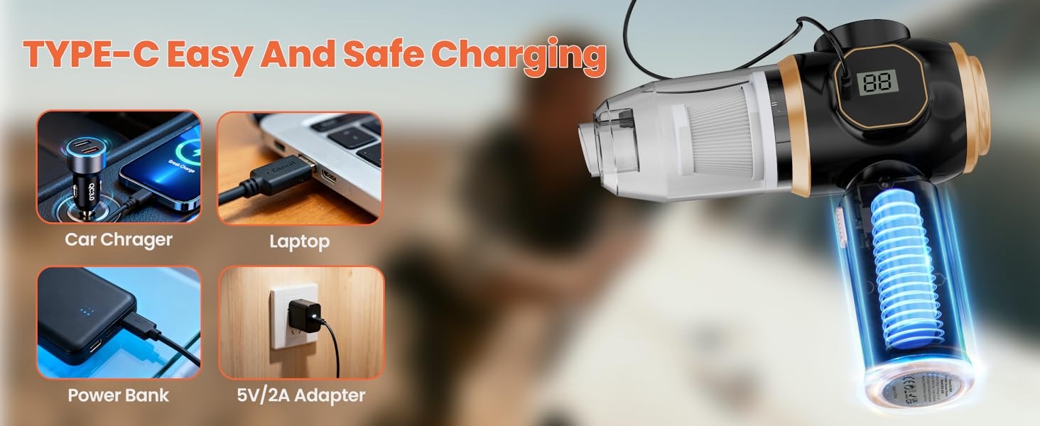 【Powerful Suction & Long Battery Life】 Equipped with advanced motor technology, this car vacuum boasts a maximum rotation speed of 50,000 RPM and a strong 19,000 Pa of suction. It has dual 2000mAh batteries, delivering up to 30 minutes of runtime on a full charge — and charging only takes 2 hours. A standard Type-C charging cable is included, making it easy to charge wherever you are.
