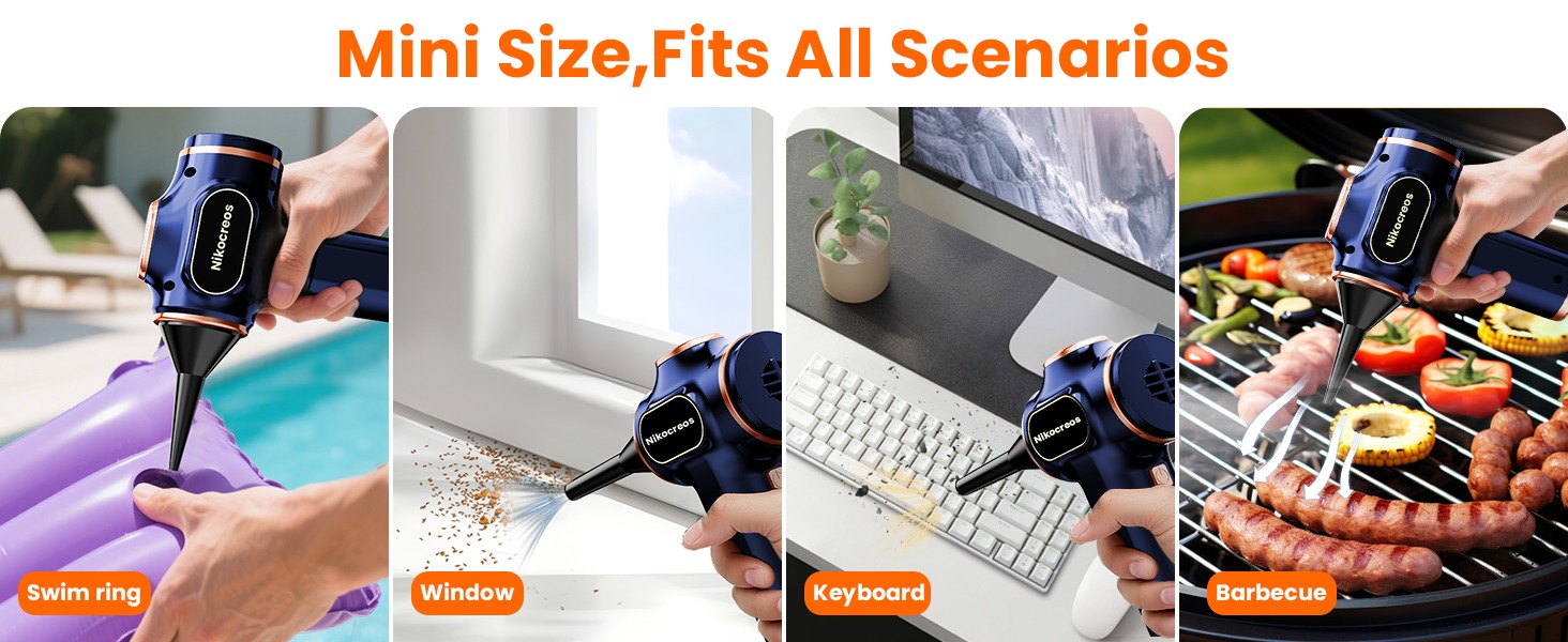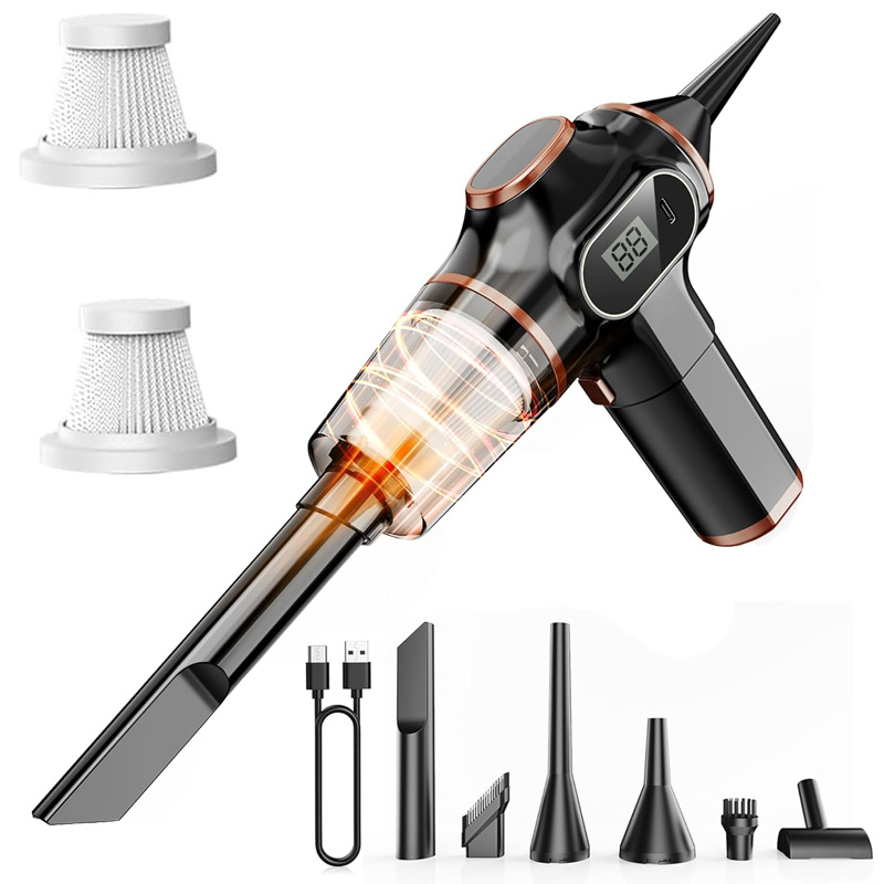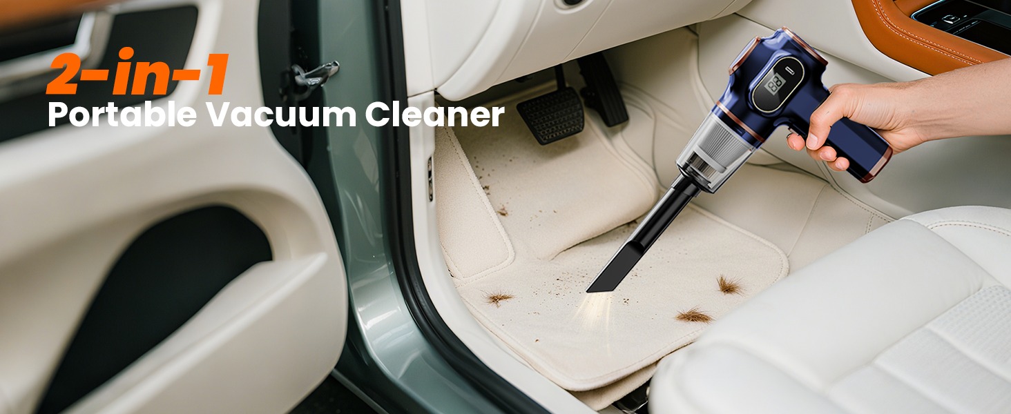 【2-in-1 Blower & Vacuum + Multiple Nozzles】 It vacuums from the front and blows from the back, with different nozzles fitting into separate ports on the vacuum’s front and rear. This portable car vacuum also comes with various detachable nozzle accessories, perfect for deep cleaning your car, computer, sofa, and windows. The crevice nozzle reaches hard-to-access areas (like between sofa cushions) and works great for narrow, irregular gaps in furniture, car interiors, and small edges. The blower nozzle clears leaves off your car and dust from keyboard crevices.