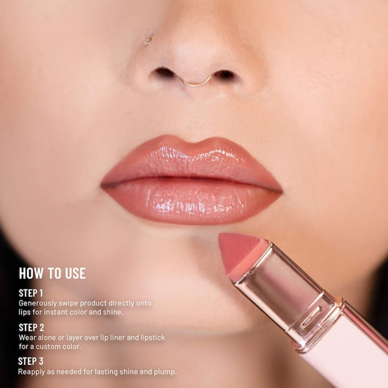 A juicy high-shine plumping lip gloss that immediately volumizes, hydrates, and restores lips for a fuller look. Formulated with nourishing hydrators like Hyaluronic Acid, Shea Butter, and Chia Seed Oil, this non sticky lip balm delivers immediate results you can sense, combining the irresistible shine of lip gloss with the lasting comfort of a lip treatment.