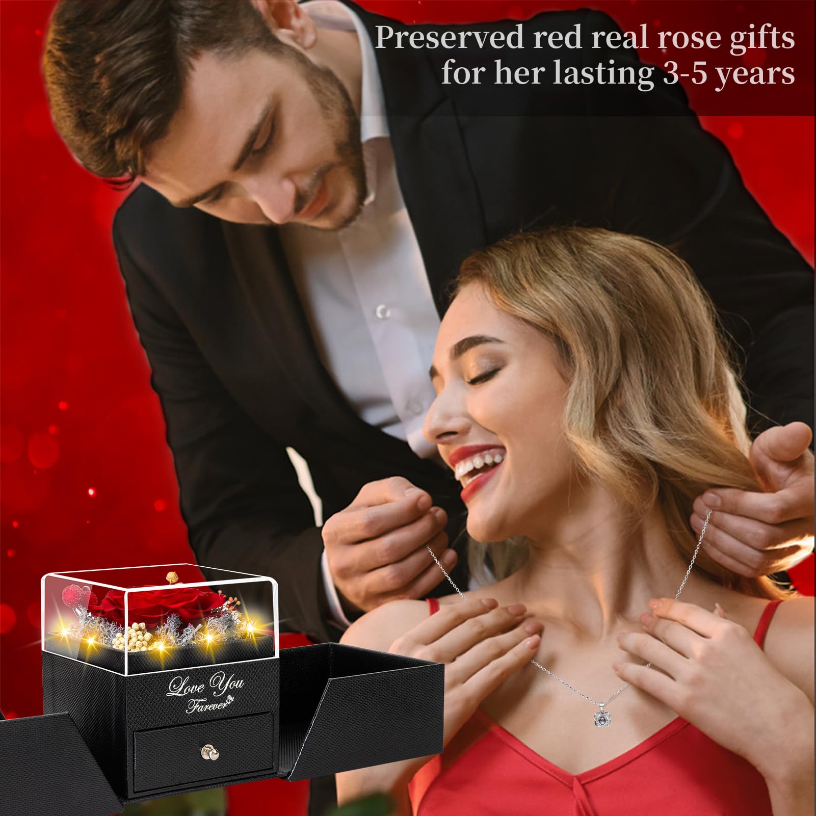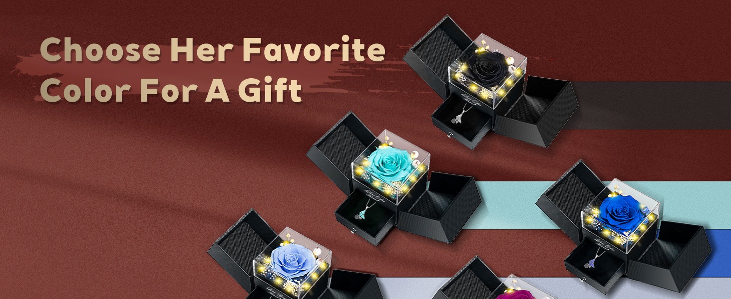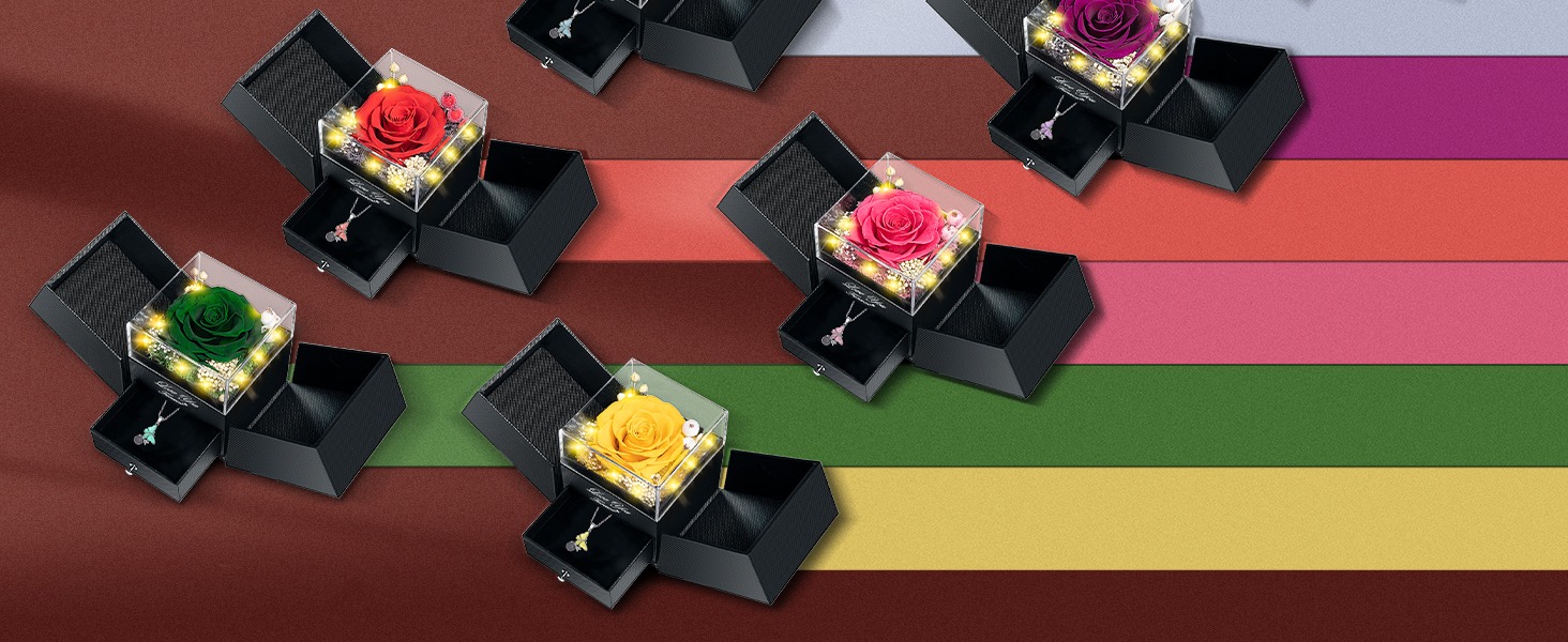🌹【 Preserved Real Rose】 Preserved rose is made of real nature fresh flowers, After a unique preservation method, it will stay for 3-5 years. No pollen. No need to water, no maintenance required. We also upgraded the rose jewelry box with lighting effects embedded in the center of the rose to make the gift look more romantic and ceremonial.