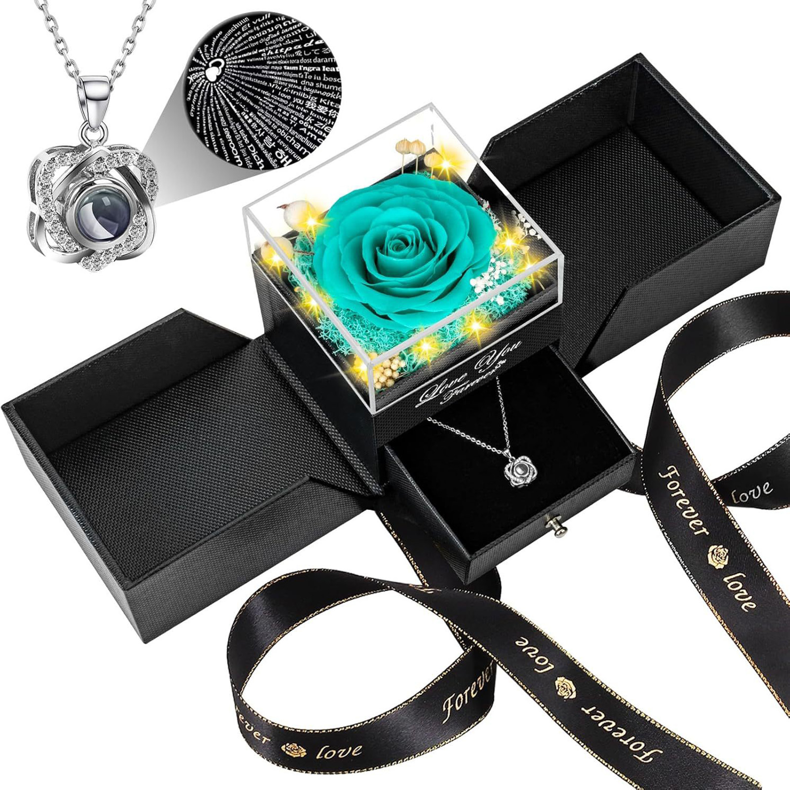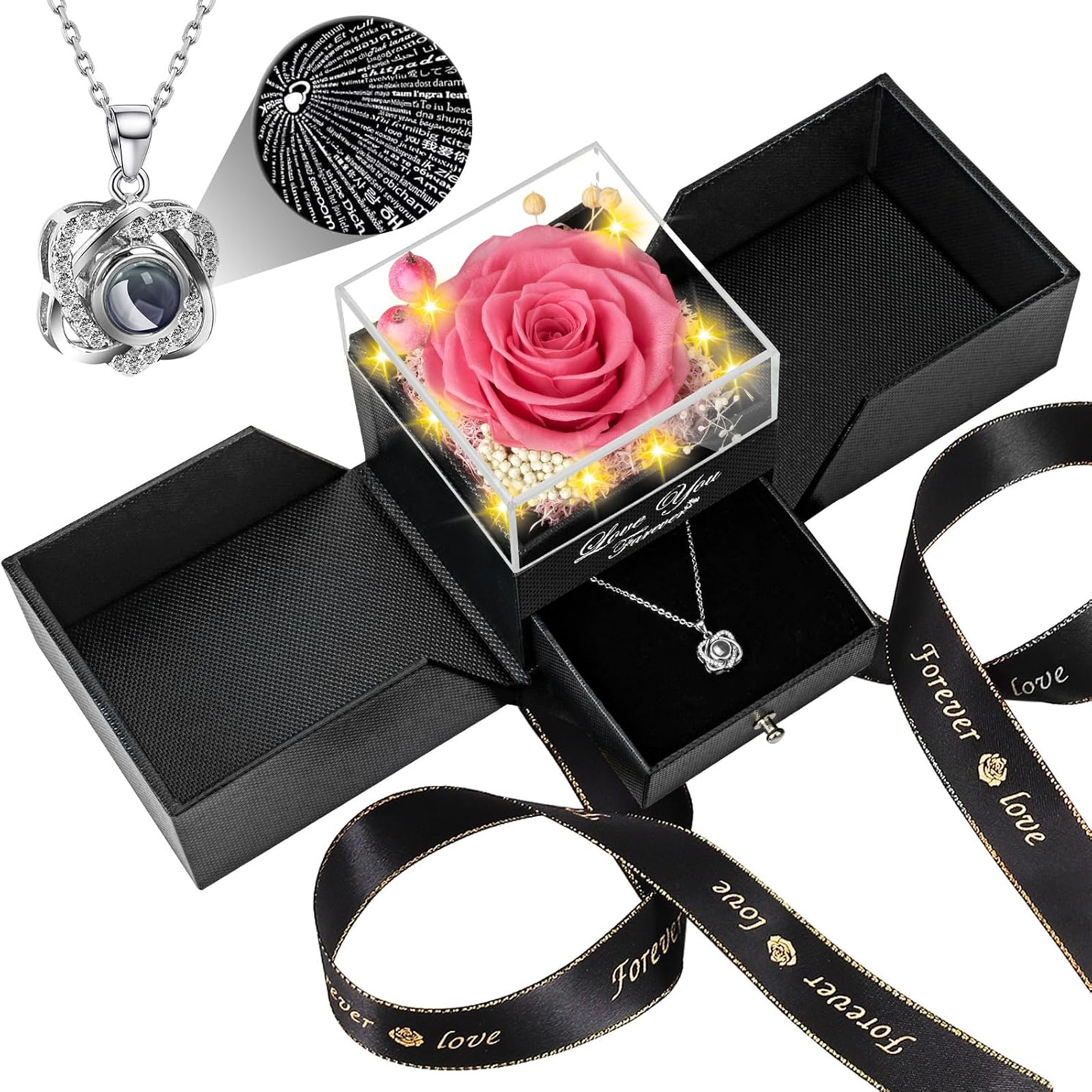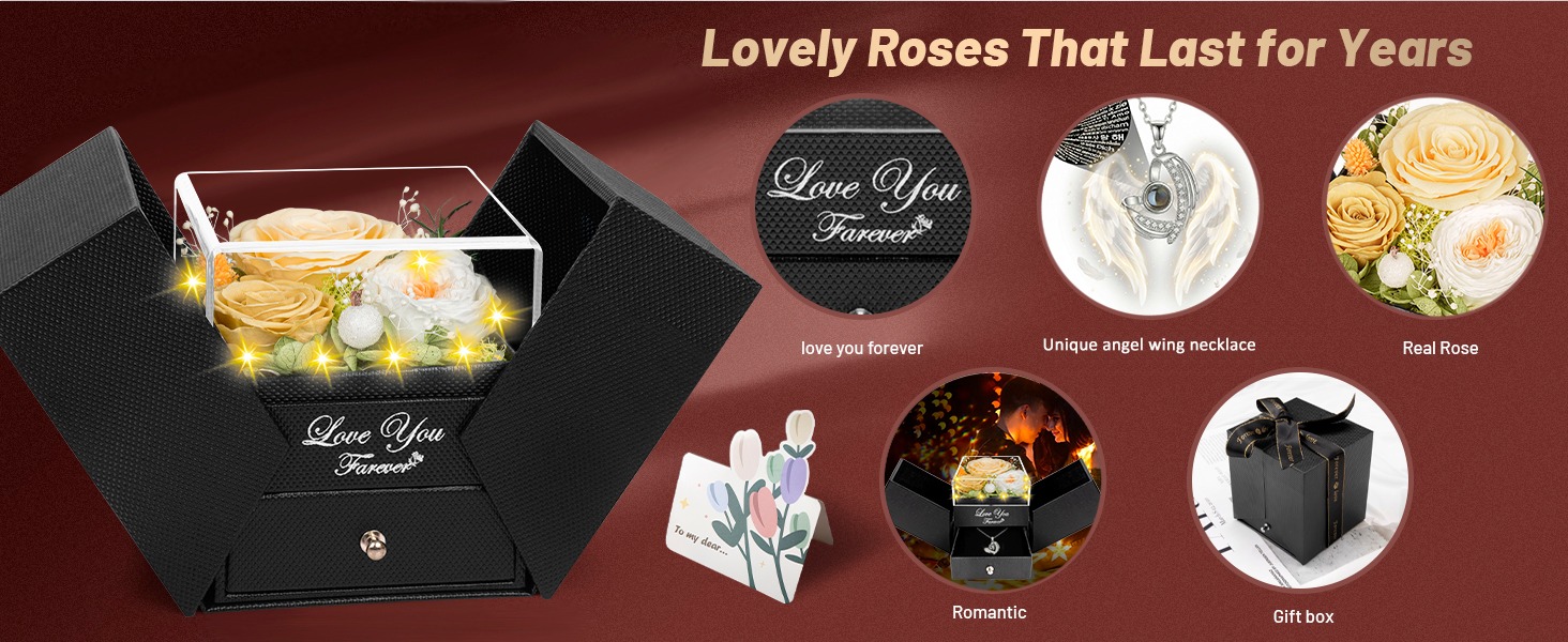 🌹【Rose Flower Gift Package and Service】Flowers for mothers day gift set includes: 1 Preserved Eternal Rose + 1 Gift Box + 1 Love Diamond Angel's Wing Necklace(With I Love You Necklace in 100 Languages)+ 1 Gift Bag + 1 Greeting Card. If there is any problem with our product, don’t hesitate to contact us as soon as possible. We will do our best to satisfy you!