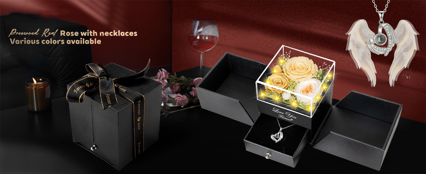 🌹【Angel Wings necklace symbolize Good luck and loved】The flower language of the red rose eternal flower series is "love that never ends" . Angel Wings necklaces are all handmade. 100 languages I LOVE YOU in Angel Wings necklace in hidden inside bottom of the box. which means there are 100 love ways, You can express your feelings to the one your love.Besides, As an exquisite luxury, it can also store other Jewelry.